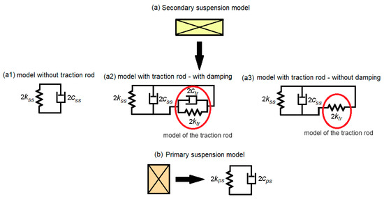 The novelty of the presented study consists of the model of the traction rod, which is integrated into the model of the secondary suspension of the vehicle. Unlike previous research, in the model of the traction rod, both the stiffness of the bar and its damping are represented.