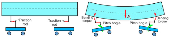 It is observed that in all three cases, ‘without traction rod’, ‘with traction rod’—with damping’, and ‘with traction rod—without damping’, the vibrations of bounce, pitch, and vertical bending of the carbody are coupled with the bogie bounce. The difference between the cases ‘without traction rod’ and ‘with traction rod’ consists of the way in which the pitch vibrations of the bogies are manifested. In the case ‘without traction rod’, these are independent vibrations. In the case ‘with traction rod’, the pitch vibrations of the bogies are transmitted to the carbody through the traction rods (Figure 3). The pitch vibrations of the bogies are coupled with the pitch and vertical bending vibrations of the carbody, and through them with the bounce vibrations of the carbody.