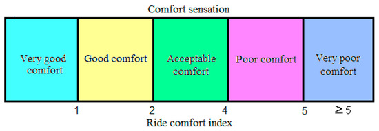 According to the mean comfort method, described in the UIC 513R leaflet [48] and the standard of railway applications EN 12299 [49], the quantification of vibration comfort is carried out using the ride comfort index (NMV) and a conventional scale that connects the values of this index and the sensation of comfort (see Figure 4).