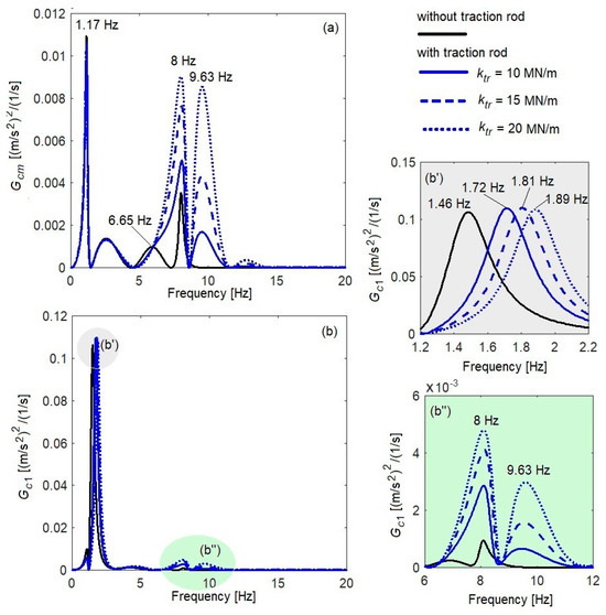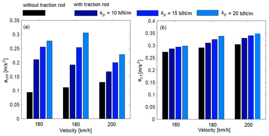 Figure 6 shows the power spectral density of the acceleration of the carbody, at a velocity of 200 km/h, for the cases ‘without traction rod’ and ‘with traction rod’—with damping’. For the case ‘with traction rod’, three values of the stiffness of the traction rod are considered, respectively: the reference value (ktr = 10 MN/m) and two analysis values (ktr = 15 MN/m and ktr = 20 MN/m).