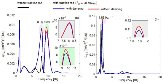 The influence of traction rod damping on the power spectral density of the acceleration: (a) in the middle of the carbody; (b) above the secondary suspension of bogie 1.