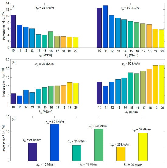Diagrams (a) and (b) in Figure 8 show the increase in the power spectral density of the acceleration at the natural frequencies of the vertical bending of the carbody (8 Hz) and the pitch of the bogie (9.63 Hz) for several values of the stiffness of the traction rod between 10 MN/m and 20 MN/m, for the case ‘with traction rod—without damping’ in relation to the case ‘with traction rod—with damping’ with ctr = 25 kNs/m and ctr = 50 kNs/m. It is observed that if the damping of the traction rod is not considered, the increase in the power spectral density of the acceleration at the frequency of 8 Hz can reach up to 10.2% (for ktr = 10 MN/m) in relation to the case ‘with damping’ for ctr = 25 kNs/m, respectively, up to 13.2% (for ktr = 11 MN/m) for ctr = 50 kNs/m. At a frequency of 9.63 Hz, the maximum increase in the power spectral density of the acceleration in the case ‘without damping’ in relation to the case ‘with damping’ is 12% (for ktr = 19 MN/m) for ctr = 25 kNs/m and of 21.8% (for ktr = 20 MN/m) for ctr = 50 kNs/m. At the natural frequency of the pitch vibrations of the carbody (diagram c), the highest increase in the power spectral density of the acceleration (12.36%) is recorded for a traction rod stiffness of 10 MN/m and a traction rod damping of 50 kNs/m.