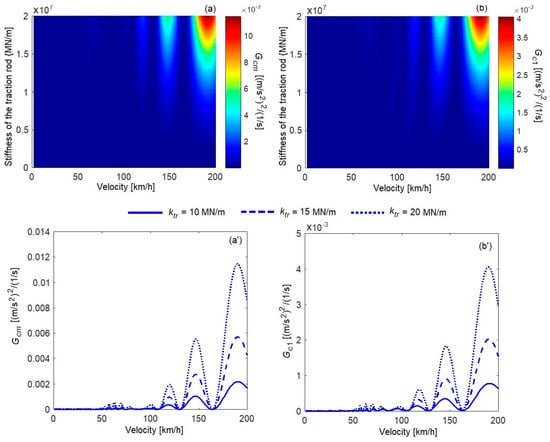 In Figure 9 and Figure 10, the power spectral density of the acceleration at the natural frequency of the vertical bending of the carbody and the natural frequency of the bogie pitch, respectively, in the velocity range between 10 km/h and 200 km/h in correlation with traction rod stiffness is represented. The general tendency is for the carbody vibration level to increase with the velocity at both natural frequencies, but the increase is not continuous due to the geometric filtering effect. Depending on the velocity, the diagrams show a succession of maxima of the power spectral density of the acceleration; these correspond to a situation wherein geometric filtering has no effect. The minima appear at geometric filtering velocities. The geometric filtering effect is more intense in the area of low velocities, where more geometric filtering velocities are concentrated, an aspect highlighted in diagrams (a’) and (b’). The influence of the stiffness of the traction rod on the level of vertical vibrations of the carbody is dependent on the velocity and on the geometric filtering effect, respectively. The largest increases in the power spectral density of the acceleration due to the traction rod occur at high velocities, when geometric filtering has no effect. For example, at the vertical bending frequency of the carbody, in the middle of the carbody (Figure 9), at a velocity of 121 km/h, there is an increase in the power spectral density of 19%, prompted by increasing the stiffness of the traction rod from 10 MN/m to 20 MN/m; at a velocity of 158 km/h, the increase is 28.8%. At the pitch frequency of the bogie, in the middle of the carbody (Figure 10), when increasing the traction rod stiffness from 10 MN/m to 20 MN/m at a velocity of 147 km/h, the increase in the power spectral density is 432.8%; at a velocity of 190 km/h, the increase is 422.7%.