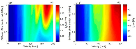 The increase in the power spectral density for the case ‘without damping’ is highlighted in the natural frequencies of the vertical bending of the carbody and the bogie pitch (diagram a), and at the natural frequency of the carbody pitch (diagram b). In the middle of the carbody, at 8 Hz, there is an increase in the power spectral density of acceleration of 3.3%, and, at 9.63 Hz, the increase is 11.8%. Above the secondary suspension, at a frequency of 1.89 Hz, the increase in the power spectral density of the acceleration is 4.7%. The increase in the power spectral density of the acceleration in the case ‘with traction rod—without damping’ also depends on the stiffness of the traction rod, as shown in Figure 8.