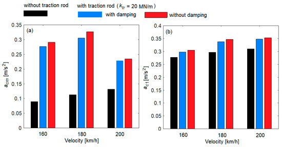 - The effect of the traction rod on the root mean square of the acceleration is particularly pronounced in the middle of the carbody at velocities above 100 km/h. Depending on the stiffness of the traction rod and velocity, there were significant increases in the root mean square of the carbody acceleration that reached almost 200%. In the absence of traction rod damping, significant increases in the root mean square (of between 0.47% and 8.9%) in the middle of the carbody were obtained, which varied depending on the velocity.