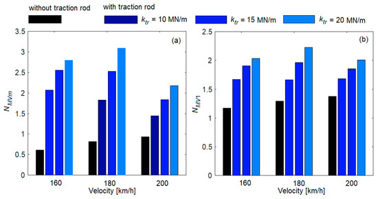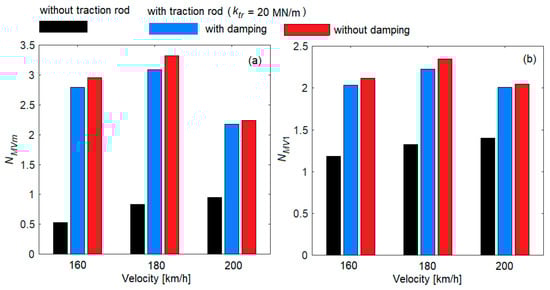 The influence of traction rod damping on ride comfort is highlighted in the diagrams in Figure 17, where ride comfort indices are presented for the case ‘without traction rod’ and for the case ‘with traction rod’, both ‘with damping’ and ‘without damping’ for ktr = 20 MN/m at velocities of 160 km/h, 180 km/h and 200 km/h.