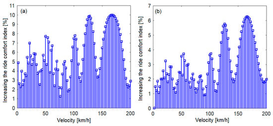 Increase in the ride comfort index for the case ‘without damping’ compared to the case ‘with damping’: (a) in the middle of the carbody; and (b) above the secondary suspension of bogie 1.