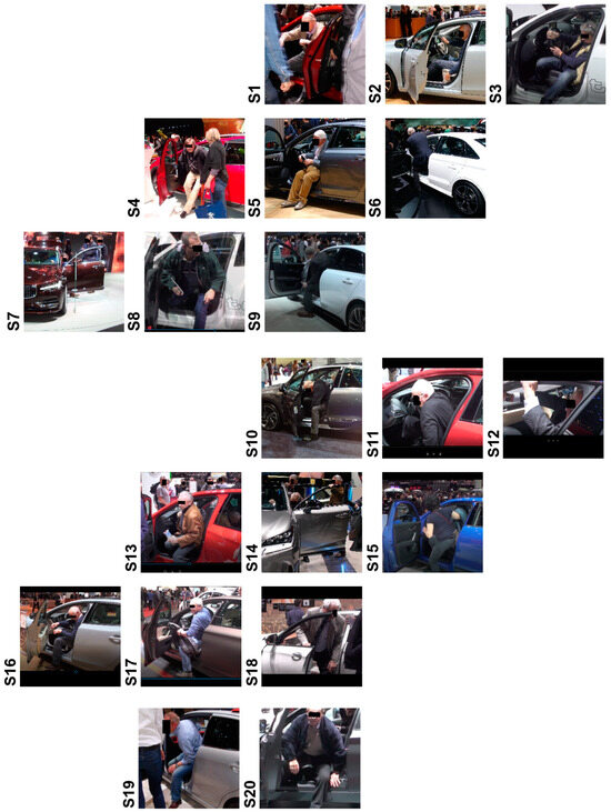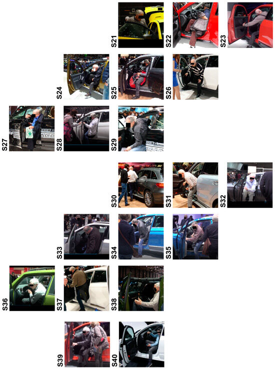 It is important to note that the GIMS took place during the cold season, so the study subjects generally wore warm, bulky, and heavier clothing, even though inside the exhibition pavilions there was a warm and comfortable environment. This motivated some individuals to hold coats in their hands and arms. We can conclude that another aspect that exerts a strong influence on movement strategies when both entering and exiting the car, regardless of the physical stature of the individual and the type of vehicle, in terms of hands and postural balance, relates to whether the individual is carrying personal objects, such as a piece of clothing—usually a coat (Figure A2, Figure A3 and Figure A7), a wallet, a bag or a backpack (Figure A1, left, and Figure A5), a mobile phone (Figure A8), or a book or magazine (Figure A9 and Figure A10). These behaviours characterise situations that can occur naturally during the daily use of cars (to which no previous study refers), which justifies further studies in this area, given that this constitutes a perceived gap in previous investigations.