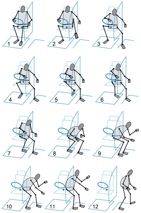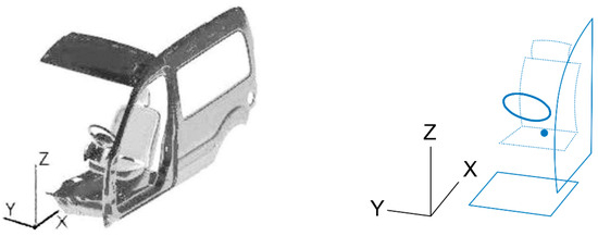 The existing literature on movement strategies for entering and exiting a car is silent when dealing with users’ interaction with the main parts of the vehicle and the influence of handholds. In this research, while exiting the car, subjects made rotational movements of the hips, trunk, and upper limbs on the seat, with support of the upper limbs on parts of the vehicle, such as the steering wheel and the door panel, which assumed special importance for physical balance and for the adoption of comfortable positions. Figure 11, illustrates this behaviour, observed recurrently in the studied individuals, using the vehicle model with cartesian references and the humanoid model as presented in Figure 5 and Figure 6.