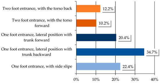 In the present study, it was found that when users got into cars, they used one-foot or two-foot strategies, which could be subdivided into specific strategies. Five distinct entry strategies were identified (Table 2): three one-foot entry strategies—(1) lateral sliding, (2) backward movement, and (3) forward movement; and two-foot entry strategies—(4) leaning forward and (5) leaning back.