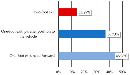 The observations regarding the movements of entering the car confirmed the results of the precursor studies [32,41], which pointed out a series of movements required to enter a vehicle, categorised into three phases: door opening; adaptation of the entrance movement; and positioning on the seat. The last two phases varied depending on the drivers, who may have used either a “one-foot” or a “two-foot” entry strategy, as each type of strategy requires a unique set of moves. The door-opening phase was consistent for all entry strategies. During the movement adaptation phase, the driver used a one-foot or two-foot placement strategy.