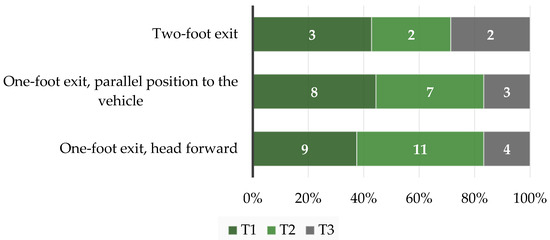 From the analysis of the graphs (Figure 9 and Figure 10), it is possible to conclude that the movement strategies during the exit process in different types of vehicles were practically uniform for the universe of the sample. However, the most prevalent strategy was the one that uses only one foot on the way out with the head leaning forward, which corroborates the results shown in other pioneering studies in this research area.