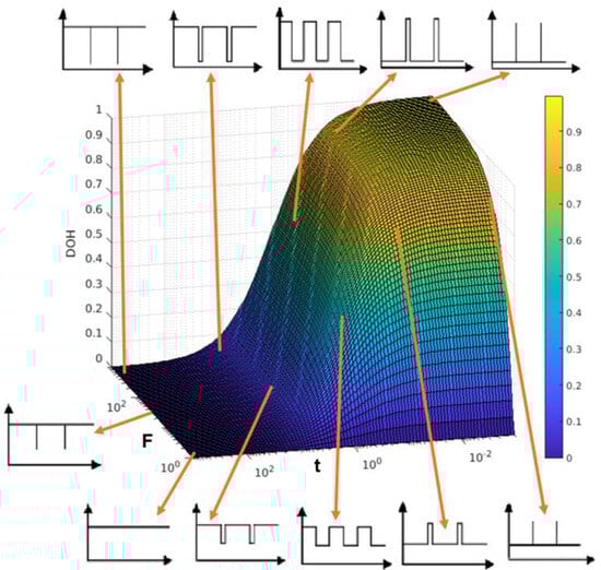 From Equation (11), we can see that a low value of DOH represents a relatively low required power output from the additional energy storage system, while high DOH represents a high required power output from the additional ESS. It is useful to express this in terms of F and t to see how the difference between maximum and minimum power loads and the time spent at those loads affect the degree at which it is required to hybridise the system. This can be shown in a graphical representation, as shown in Figure 3.