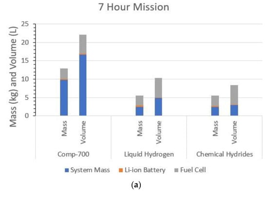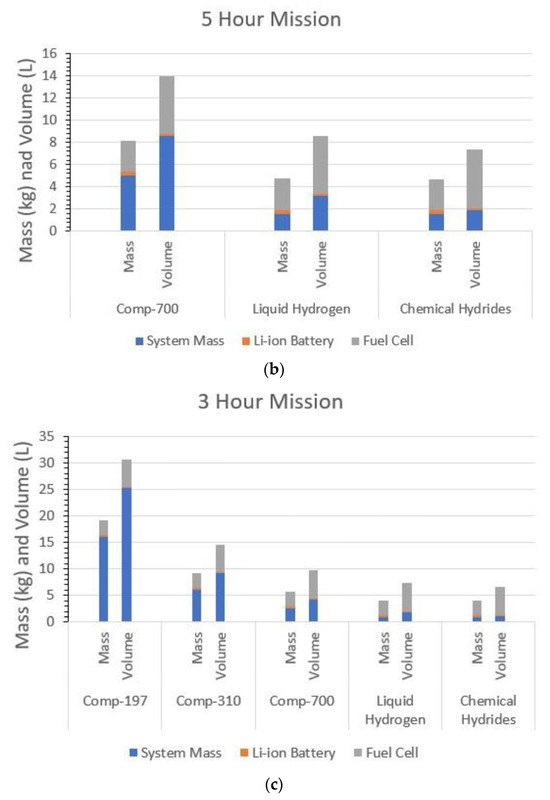 Mass and volume balance analysis of hybrid fuel cell system: (a) 7 h mission, (b) 5 h mission, and (c) 3 h mission.