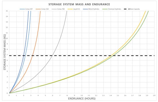 The achievable endurances for the fuel storage system mass for each of the storage methods are illustrated in Figure 6. The mass capacity is set to 6.86 kg (dashed line), which is the total capacity for the energy system (10 kg) minus the fuel cell and battery masses.