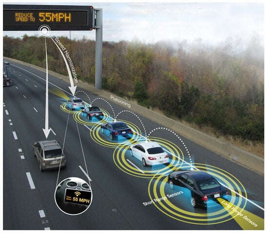 Vehicle-to-infrastructure (V2I) and vehicle-to-vehicle (V2V) communications are considered beneficial to road safety []. This example shows the infrastructure communicating the current speed to a vehicle and a platoon of vehicles (public domain from the US Department of Transport).