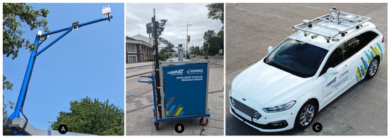 The University of Warwick campus is used as a testbed for V2X and vehicle research and has (A) fixed V2I equipment and RSUs, (B) mobile V2I equipment and RSUs, and (C) research vehicles equipped with V2I equipment, vision systems, and OBUs. The images (by the authors) are of WMG V2I equipment.