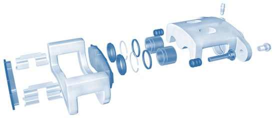 - Ingale, S.; Kothawade, S.; Patankar, A.; Kulkarni, R. Design and analysis of a brake caliper. Int. J. Mech. Eng. Technol. (IJMET) 2016, 7, 227–233. [Google Scholar]