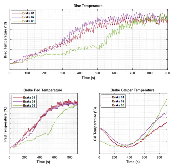 In Figure 4, the disc, brake pad, and caliber temperatures for three typologies of brake systems are shown.