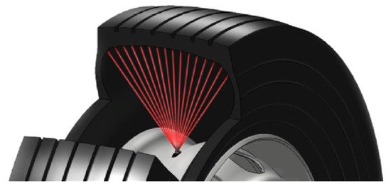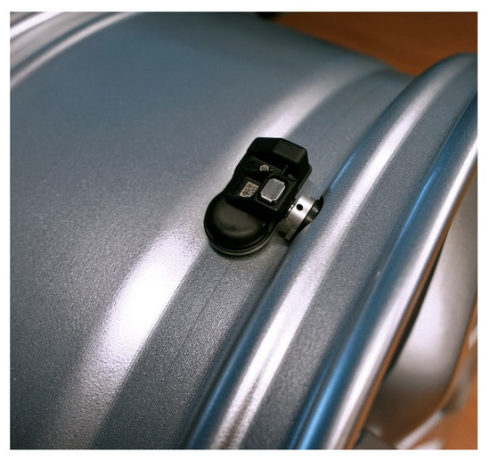 In regard to the value of pressure and temperature for the inner air, they were measured with the TPMS sensor. This sensor was installed on the side of the rim and contained the flywheel to effect the inflation of the tire (Figure 7).