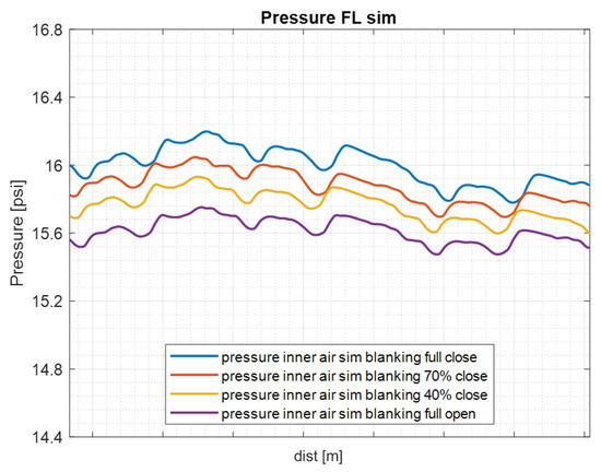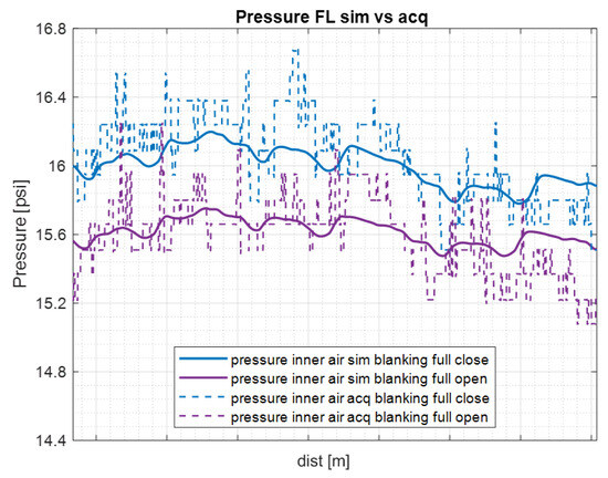 The analysis reported here was performed for a straight section of the circuit where the driver proceeded at a constant speed of 130 km/h. Figure 9 presents the results of the simulated pressure of the inner air (solid lines) compared to the acquisition values (dashed lines) for the two extreme cases: full open blanking (blue line) and full close blanking (purple line). It is evident that the pressure varied significantly between these two cases, indicating the influence of the blanking position on the airflow within the system. The initial conditions were the same, and it can be seen that the run with full close blanking had higher pressure values than in the case of fully open blanking. The reason for this may lie in the fact that with a 100% blanking, it happens that the brake discs are more difficult to cool down, leading to higher temperatures. Radiation and convection heat the rim which is in direct contact with the air inside the tire, which increases the temperature and therefore also increases pressure. The simulation results obtained for both cases demonstrate that the used model tried to follow the progress of the experimentally acquired model. Obviously, the experimental model introduces quite high frequencies of update, while the simulated one has a more smooth course.