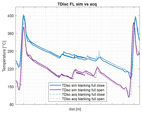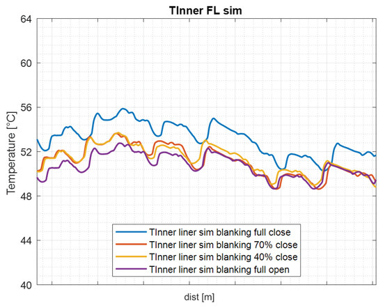 Similarly, Figure 10 illustrates the simulation results for the inner liner temperature, showcasing pronounced variations between the full open and full closed blanking scenarios. In this case, almost at the end of the straight line, before the braking phase, the simulated and the acquired models tend to diverge. This seems to be due to the fact that at high speeds, the phenomena of fluid flows is not yet well analyzed by the model that is in a first phase of development. However, it is a fairly promising first basis from which to develop and interpret well all the phenomena.