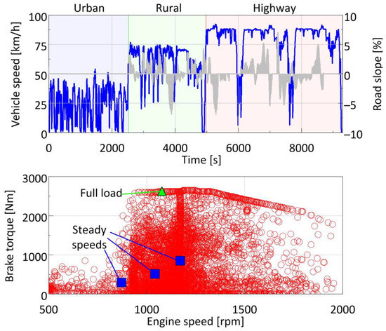 The truck was tested under a pre-determined In-Service-Conformity (ISC) cycle developed at JRC for N3 category trucks [34]. The cycle is compliant with the Euro VI step E regulation [35] requirements. It contains distinct urban, rural, and highway sections, with relative time shares of 27.1%, 26.4%, and 46.5%, respectively. The corresponding average speeds are 23, 59, and 80 km/h. The vehicle speed and road slope profiles, as well as the corresponding engine map, are illustrated in Figure 1. The slopes of the urban part were very low because the area was quite flat. We decided not to include them as the values were close to the experimental uncertainty of determining them. All ISC tests were performed with the engine cold and the coolant temperature below 30 °C as prescribed in the Euro VI step E regulation.