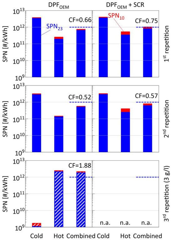 Summary of Solid Particle Number (SPN) emissions following the proposed Euro 7 evaluation methodology for the tests where DPFOEM was used. Charts on the left and right planes correspond to emission levels at DPF out and SCR out positions, respectively. Charts on the top, middle, and bottom panels correspond to the three ISC repetitions, the last one (depicted with white stripes) being performed with a pre-loaded DPFOEM. Blue bars correspond to SPN23, while red bars to SPN10. The dashed lines indicate the proposed limit (5 × 1011 #/kWh for the 100th percentile and 2 × 1011 #/kWh for the 90th percentile), while the numbers on top correspond to the conformity factors (ratio of average emissions over applicable limit). Owing to the swapping of APC sampling positions (Table 1), SPN measurements were not available (n.a.) for some tests. HFC = High Filtration efficiency Cordierite; CF = Conformity Factor; DPF = Diesel Particulate Filter; OEM = Original Equipment Manufacturer; SCR = Selective Catalytic Reduction.