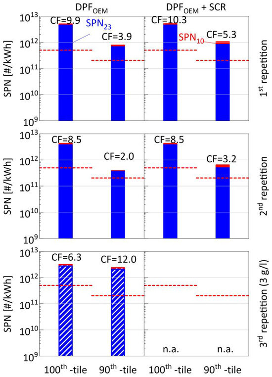 Focusing on the first two repetitions, which were performed with the DPFOEM in a clean state, the 100th and 90th percentile results were ~1.2 and 2.2 times higher than the corresponding cold and hot start results evaluated following the Euro VI step E methodology (Figure 2). This is a consequence of the shift from 23 nm to 10 nm and the inclusion of all MW (starting from engine ignition) for the evaluation of both percentiles. Under the specific test conditions (tests performed following regeneration of the DPFOEM), the 100th percentile proposed limit of 5 × 1011 #/kWh represents a more demanding performance criterion, with the two tests exceeding it by 10.3 and 8.5 times. The 90th percentile results are above the corresponding proposed limit of 2 × 1011 #/kWh by 5.3 and 3.2 times, respectively. The effect of SCR was more pronounced on the 90th percentile results, with SPN10 emissions increasing by 2.1 × 1011 #/kWh to 2.4 × 1011 #/kWh, representing a 42 to 76% increase over SPN23. The 100th percentile results were less affected, with the percentage differences (+3% and −2%) being within the measurement uncertainty of SPN measurement equipment.