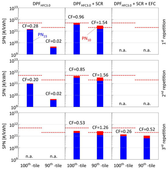 Summary of Solid Particle Number (SPN) emissions following the proposed Euro 7 evaluation methodology for the tests where DPFHFC3.0 was used. Charts on the left, middle, and right planes correspond to emission levels at DPF, SCR, and EFC out positions, respectively. Charts on the top, middle, and bottom panels correspond to the three ISC repetitions. Blue bars correspond to SPN23, while red bars to SPN10. The dashed lines indicate the proposed limit (5 × 1011 #/kWh for the 100th percentile and 2 × 1011 #/kWh for the 90th percentile), while the numbers on top correspond to the conformity factors (ratio of average emissions over applicable limit). Owing to the swapping of APC sampling positions (Table 1), SPN measurements were not available (n.a.) for some tests. HFC = High Filtration efficiency Cordierite; CF = Conformity Factor; DPF = Diesel Particulate Filter; OEM = Original Equipment Manufacturer; SCR = Selective Catalytic Reduction; EFC = Emissions Finishing Cordierite.