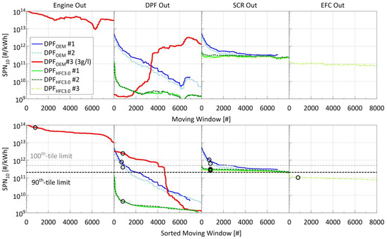 Overall, both DPFOEM states led to an exceedance of the proposed Euro 7 90th and 100th percentile limits. However, the regeneration of the loaded DPFOEM was found to be a more demanding operating condition in the sense that it resulted in prolonged operation at elevated SPN10 emissions compared to cold start operation with clean DPF, albeit with a 25% to 35% 100th percentile result. This is reflected in the sorted MW results in Figure 5 (bottom panel). Namely, it took ~4100 and 4600 windows for the SPN10 results to reach the proposed Euro 7 limits of 5 × 1011 #/kWh and 2 × 1011 #/kWh, respectively, with the regeneration of the DPFOEM. With an empty DPFOEM, the corresponding thresholds were reached after 1050 and 2050 MWs, respectively.