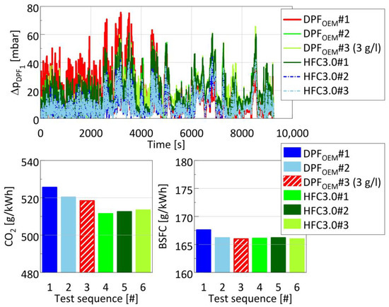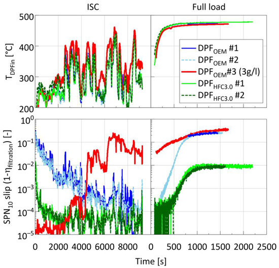 Figure 6 provides some more insights into the performance of the two filters. The real-time SPN10 slip, defined as the ratio of downstream to upstream SPN10 concentrations, is compared for the different filters over all ISC and full load tests. The duration of the full-load testing was sufficient to stabilize the SPN10 slip at the same levels between repetitions with the same type of filter. In the case of the DPFHFC3.0, SPN10 slip stabilized at ~0.01, corresponding to 1 − 0.01 = 99% filtration efficiency, which matches the clean filtration efficiency for the specific prototype. This suggests that the conditions prevailing at the specific mode (DPF inlet temperature and NOx concentration of ~475 °C and 1000 ppm, respectively) suffice for a nearly complete clean-up of the DPF. The corresponding filtration efficiencies of the DPFOEM dropped to 1 − 0.28 = 72% for the original DPFOEM, and 1 − 0.4 = 60% for the soot loaded new DPFOEM. The ash accumulating on the original DPFOEM over 20,000 km could explain the improved filtration efficiency. These filtration efficiencies are representative of unloaded Euro VI step E technology DPFs [41].