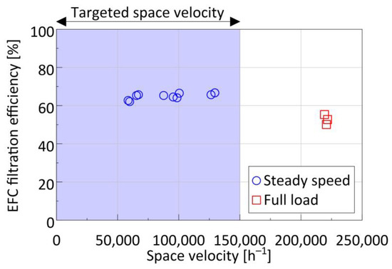Figure 7 compares the measured filtration efficiency of the EFC overall steady speed and full load tests. Results are plotted as a function of the space velocity defined as the ratio of the volumetric flow rate (calculated at standard conditions of 21 °C and 1 atm) to the EFC volume. Filtration efficiency ranged between 62% and 67% up to 125,000 h−1. At the highest tested space velocity of ~225,000 h−1, the filtration efficiency dropped to 47–55%. It should be stressed that the specific condition falls outside the targeted range of space velocities owing to the use of a single EFC instead of two in parallel.