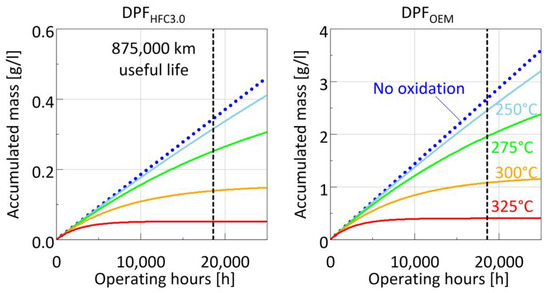 Assuming a useful life of 875,000 km (based on the Euro 7 proposal) and the average ISC speed of 47 km/h, the total operating hours are calculated to be 875,000/47 ≈ 18,600 h. At an average emission rate of 6 × 10−5 mg/s, a total mass of 4 g, or equivalently 0.43 g/L, originating from the SCR system would have reached the two parallel EFCs. The corresponding soot mass escaping the upstream DPF would be 0.57 g/L in the case of DPFHFC3.0 (with an average emission rate of 8 × 10−5 mg/s) and 4.3 g/L in the case of the DPFOEM (with an average emission rate of 6 × 10−4 mg/s). Given the finite filtration efficiency of the EFC, at a maximum, 60% of the above masses would eventually be trapped. The results suggest that even if no oxidation takes place, the accumulated mass on the EFC is expected to be at maximum (0.43 + 0.57) × 0.6 = 0.6 g/L when a DPFHFC3.0 is employed upstream. These levels are too low to have any significant impact on the filtration efficiency of the EFC [46]. With the DPFOEM, however, some deterioration in the filtration performance is to be expected unless the accumulated soot can be oxidized.