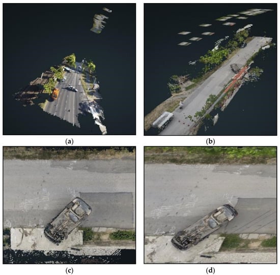 Deformations detected in the results of image procession. (a) Three-dimensional point cloud of a real accident scene taken in a single grid path with vertical camera—tilted image (Source: Varga, P.); (b) Three-dimensional point cloud of a real accident scene taken in a single grid path with vertical camera—seemingly correct (Source: Harmat, I.); (c) Point cloud (b) from above (Source: Harmat, I.); (d) Deformed orthomosaic corresponding to (c) (Source: Harmat, I.).