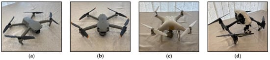 The drones used for the experiment. (a) DJI Mavic Air 2; (b) DJI Air 2S; (c) DJI Phantom 4; (d) DJI Inspire 1 v2.0.