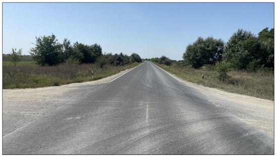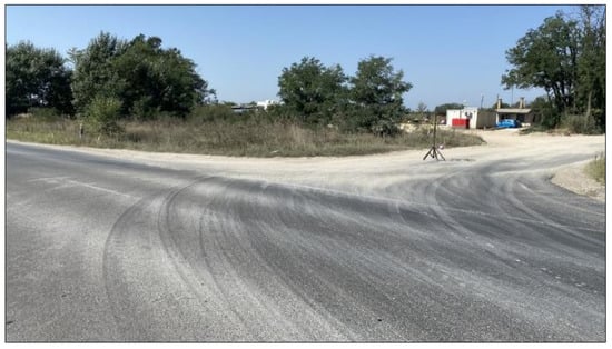 The experiment was conducted along a straight, horizontal section of the lower ranking Road 5207 (47.23501099292472, 19.11899903515487) in Hungary. The site was selected because the road runs on a straight embankment, no trees interfere with the view and there are road markings (Figure 3). At the end of the section there is a junction with a dirt road, but the junction itself is paved (Figure 4).