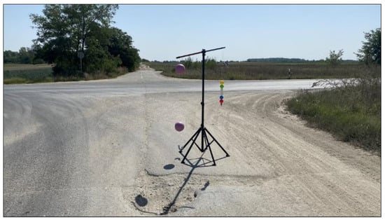 Also, a custom-made experimental device was set up, on which two plumb bobs were suspended. Colored plastic balls were strung across their diameter onto the string of the plumb bobs in order to make the position of the string visible on the photos. The distance between the centers of the large purple balls was 1 m. The device was set up on the side road, in a location visible to the drone in all flight patterns (Figure 5). The device could not be set up on the main road itself, as it would have disturbed the traffic.