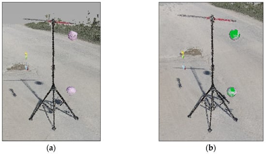 Another method was also tested to check the vertical accuracy of the point cloud. The custom-made device (see Figure 5 in Section 2 above) had two vertical strings with plumb bobs, one enhanced with small and the other with larger balls. Only the larger balls were well visible on the point clouds, thus the string with the smaller balls could not be taken into account.