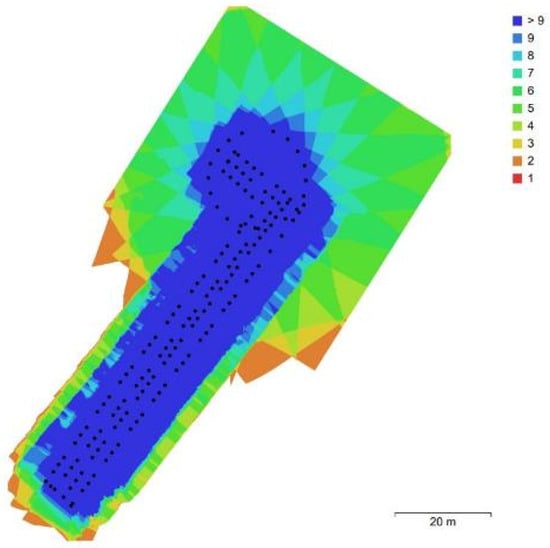 Photos were taken at approximately every 2 m, which ensured that each point designated was visible at least on 9 different photos within a mission (blue area in Figure 9 and Figure 10).