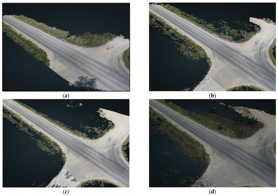Result of processing Block 1 (nadir) and Block 2 (POI) images together. (a) DJI Mavic; (b) DJI Air2S; (c) DJI Phantom; (d) DJI Inspire.