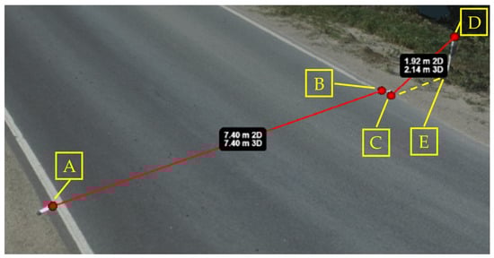 Distances measured on the 2D orthomosaic and the 3D point cloud. A, B, C—points on the outer side of the road marking line. D—point at the top of the verge marker post. E—projection of Point D on the horizontal plane of Point C.