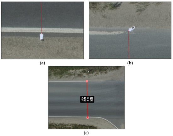 Distances measured between the two arrow heads on the 2D orthomosaic and the 3D point cloud. (a) left side; (b) right side; (c) whole distance.