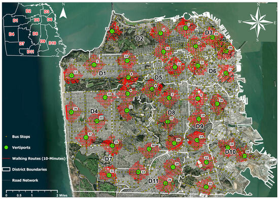 The authors collected relevant data for a case study of a U.S. city, San Francisco in California. The population, income, and employment data were census-block level and available from the American Community Survey []. GIS shapefiles of San Francisco transit stops and the district boundaries were available at the San Francisco Open Data website []. There were 3245 bus stops in the city’s road network. To reduce computational complexity, the authors organized the data into 11 supervisory districts. The workflow converted population, employment, and income data at the census-block level into point shapefiles associated with their geospatial locations and then spatially joined these to the census block polygons. Subsequently, a GIS dissolve procedure aggregated that data at the district level. Population, employment, and per capita income represent demand factors that would influence the number of vertiport placements in each district. The GIS workflow joined the transit stop points to the census block polygons and San Francisco district shapefile to show the bus stops within each of the 11 district boundaries. The workflow also sourced the latest data on registered businesses in the city of San Francisco from the San Francisco Open Data website []. This data enabled the calculation of the percentage of businesses covered by the proposed vertiports within a given walking distance threshold.