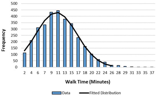 An alternative placement strategy may be to simply locate vertiports in the highest population tracts of each district to serve a potential demand. To compare the impact of the two placement strategies, the workflow placed a single vertiport at a bus stop near the centroid of the highest population tract in each district. The workflow then placed a single vertiport in each district by using the spatial optimization method. The workflow then created a distribution of the walk times from all districts, one for each approach. The workflow then fitted a function to each distribution and conducted a statistical test for goodness-of-fit.