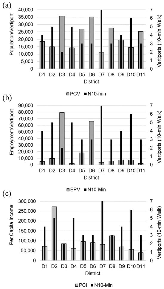 Previous studies suggested that planners should consider the population, employment, and income of users in vertiport placement decision-making [,,]. The workflow showed the relationship between the number of vertiports placed in a district, overlaid with data on the population, employment, and income. This additional information would allow planners to further adjust the number of vertiports in each district to balance demand based on those other criteria.