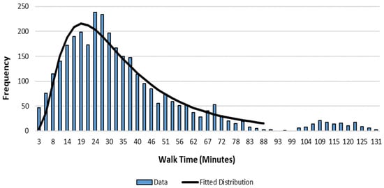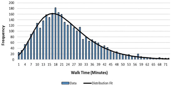 Figure 6 shows the highest population tracts in each district to consider for the case of placing a single vertiport to compare the distributions with the single optimal placement. Figure 7 and Figure 8 show the walk-time distribution for the single vertiport placement in the highest population tracts of each district and the optimal placement, respectively. The best fit distributions for each are the lognormal. The chi-squared test provided a p-value of zero and 0.25 for the highest population tract and optimal scenarios, respectively. Therefore, only the optimal placement case followed a classic distribution for the walk time. Moreover, the highest population tract exhibited some bi-modality, suggesting a strong bias toward poor accessibility. The optimal placement strategy reduced both the mean and variance in walk time over the alternative placement strategy.
