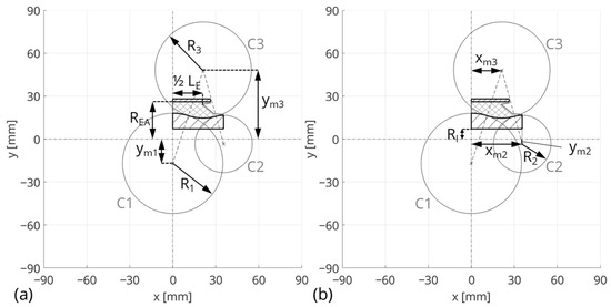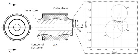 The circle C1 is defined in the x-direction with in the middle of the bushing. The radius of circle 2 is defined with a fixed value of . At the inner core, there is a hole with . The parameter depends on and represents the half-length of the inner core (see Figure 6b). Due to the model simplification of the free elastomer contour, the parameter is added to the width of the elastomer: