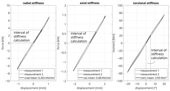 The simulation results based on the identified material parameters from Table 3 are compared with the test rig results in Table 4. The relative deviation between the stiffnesses from the test rig measurement and simulation is 9.5% in the radial load direction, 0% in the axial load direction, and −17% in the torsional load direction.