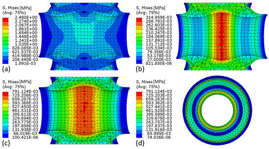 Example simulation results of the reference bushing, inhomogeneous von Mises stress distribution on the deformed geometry of the elastomer under (a) radial, (b) axial, and (c,d) torsional loads scaled by factor 2 for radial load and factor 4 for axial and torsional loads.